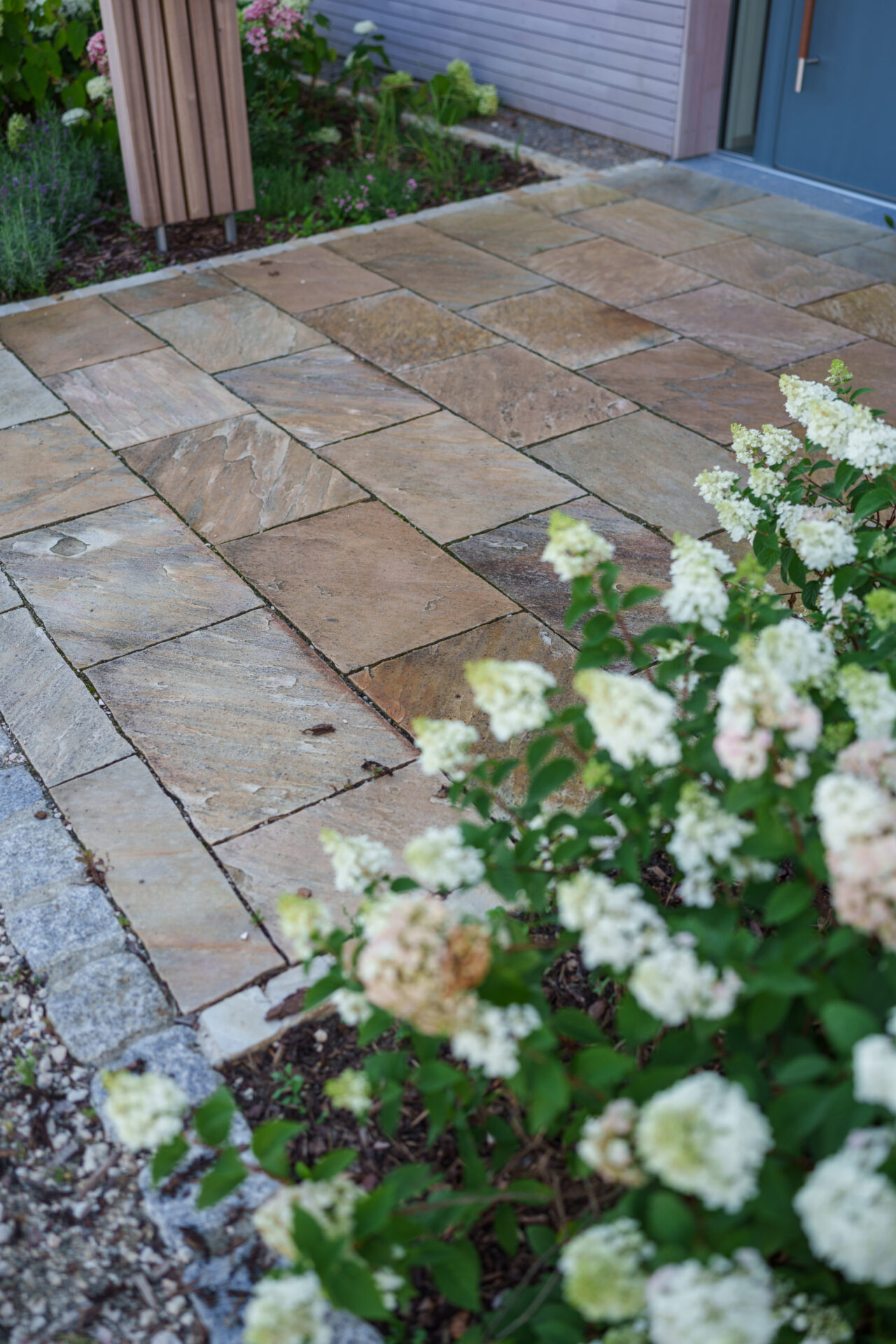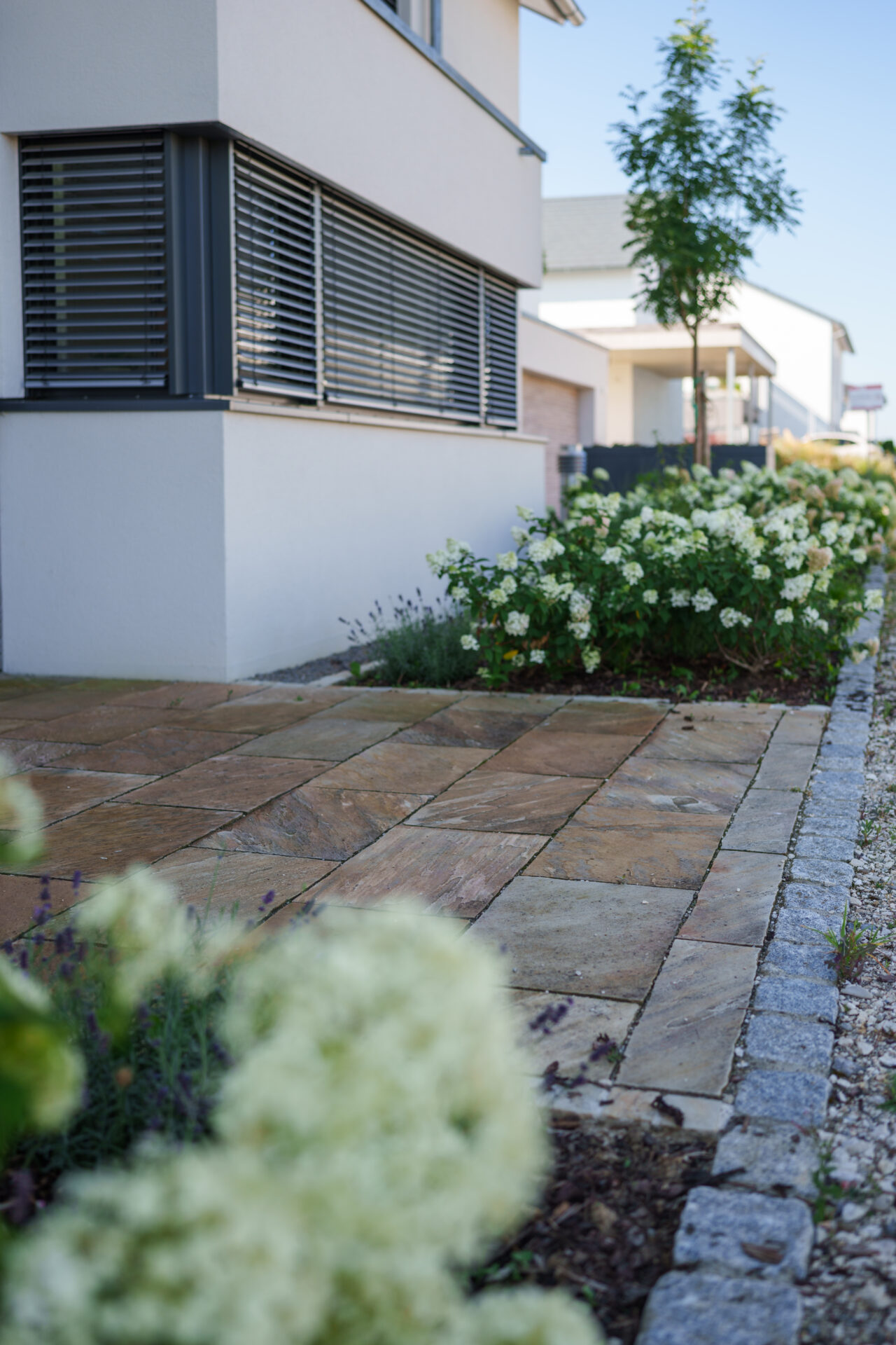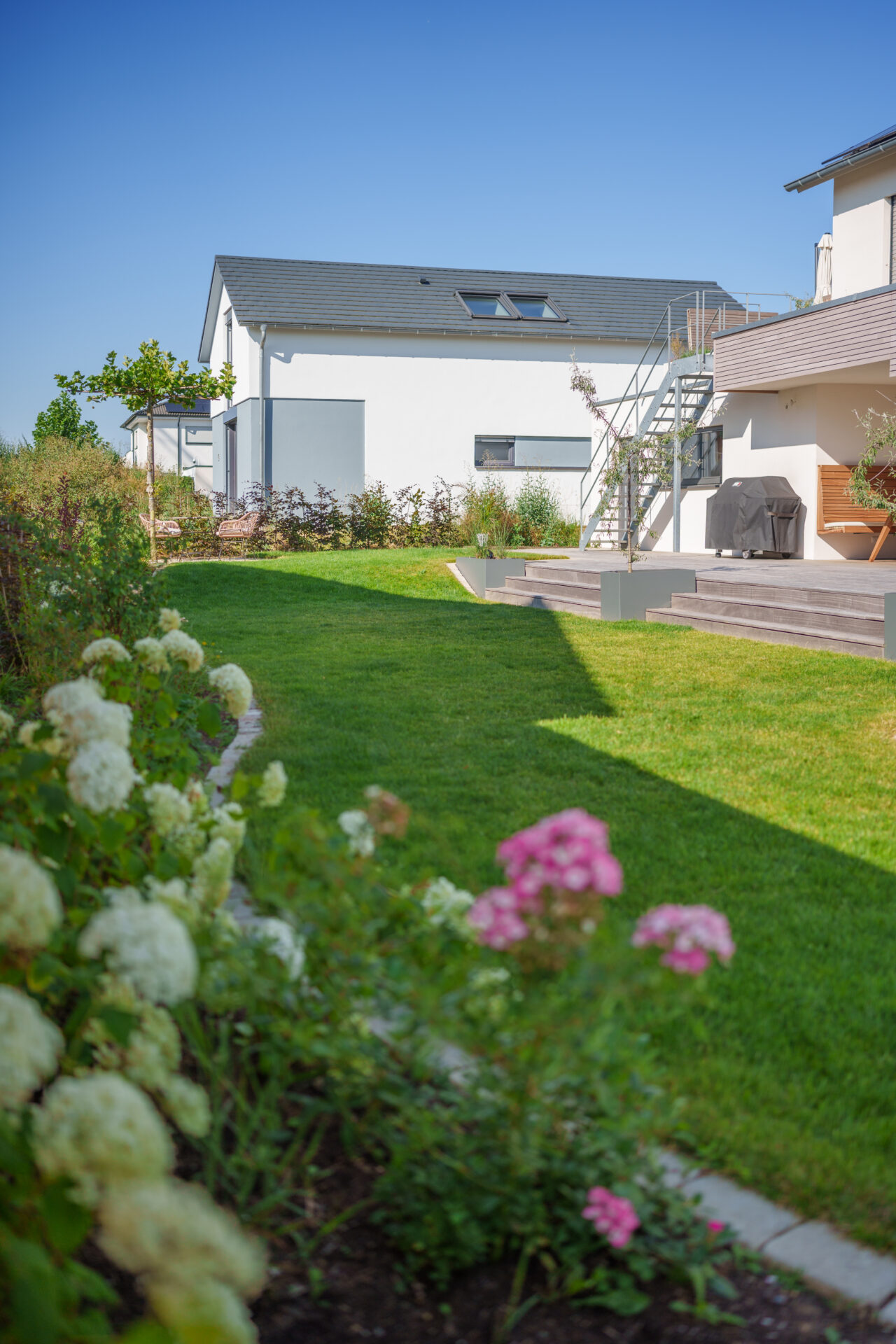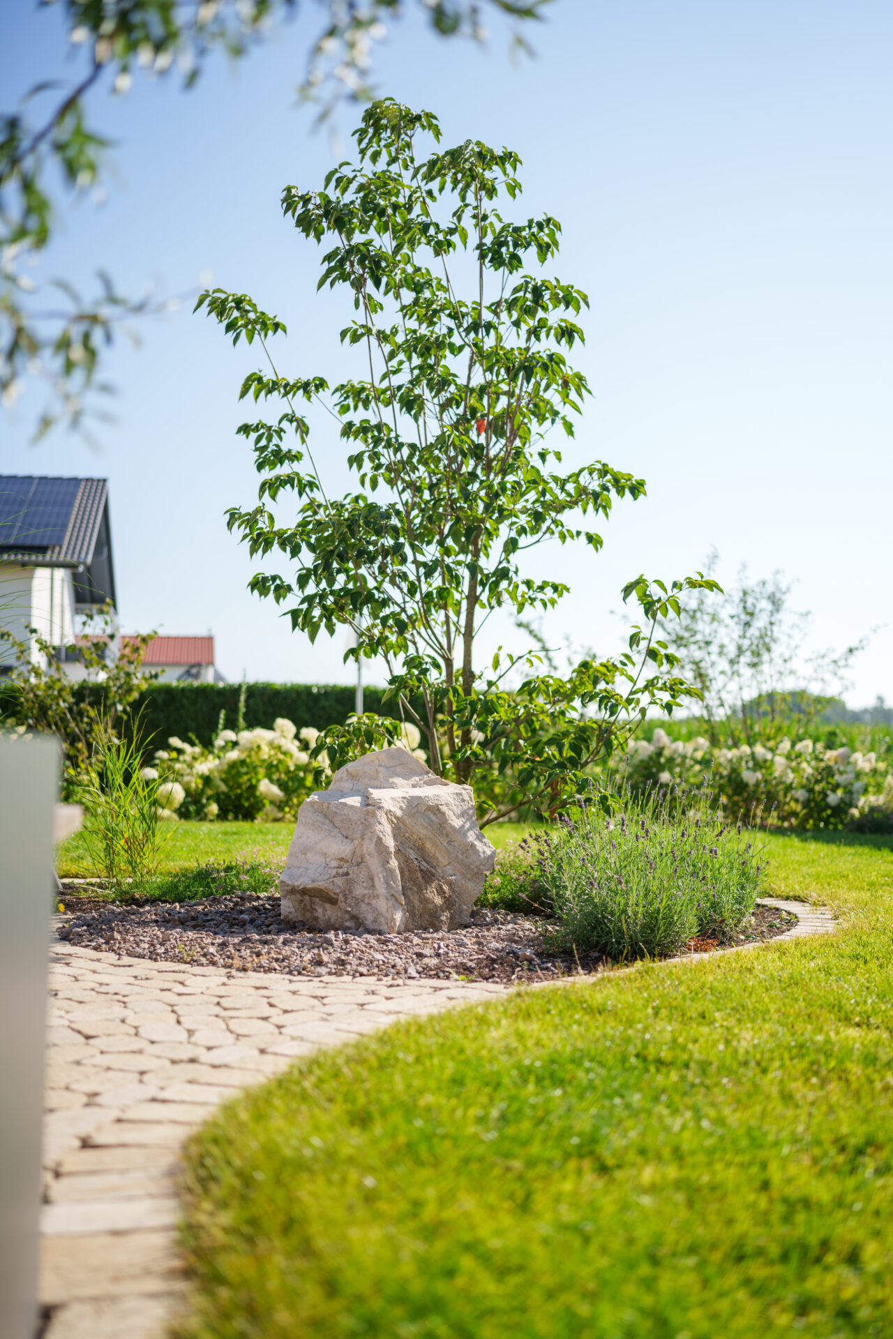 Ein Garten mit umspielender Bepflanzung, in dem sich Rasen auf zwei Ebenen an die große Holzterrasse anschmiegt. Die Hauptwege wurden mit edlen Quarzitplatten belegt, die Hofzufahrt und kleine Sitzplätze wurden aus kalkschattiertem Betonpflaster gebaut. Die Dachplatane spendet Schatten auf dem Sitzplätzchen, währen der Blumenhartriegel neben dem Quellstein blüht. Der Vorgarten ist ein Meer aus Hortensien und Lavendel, gespickt mit Gräsern und Rosen.