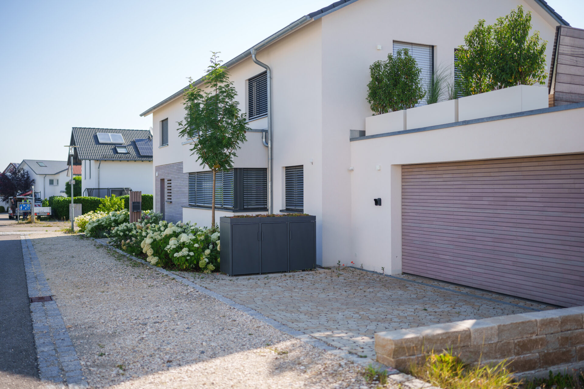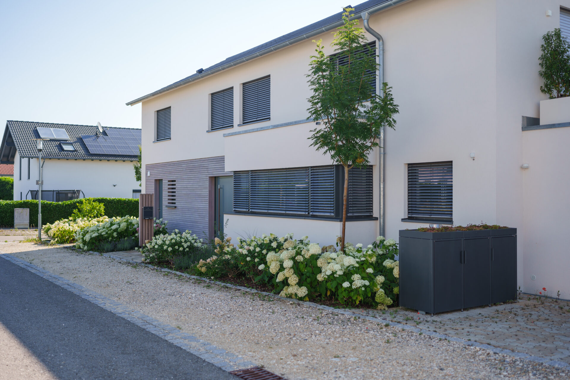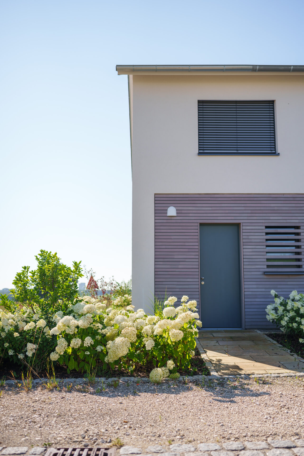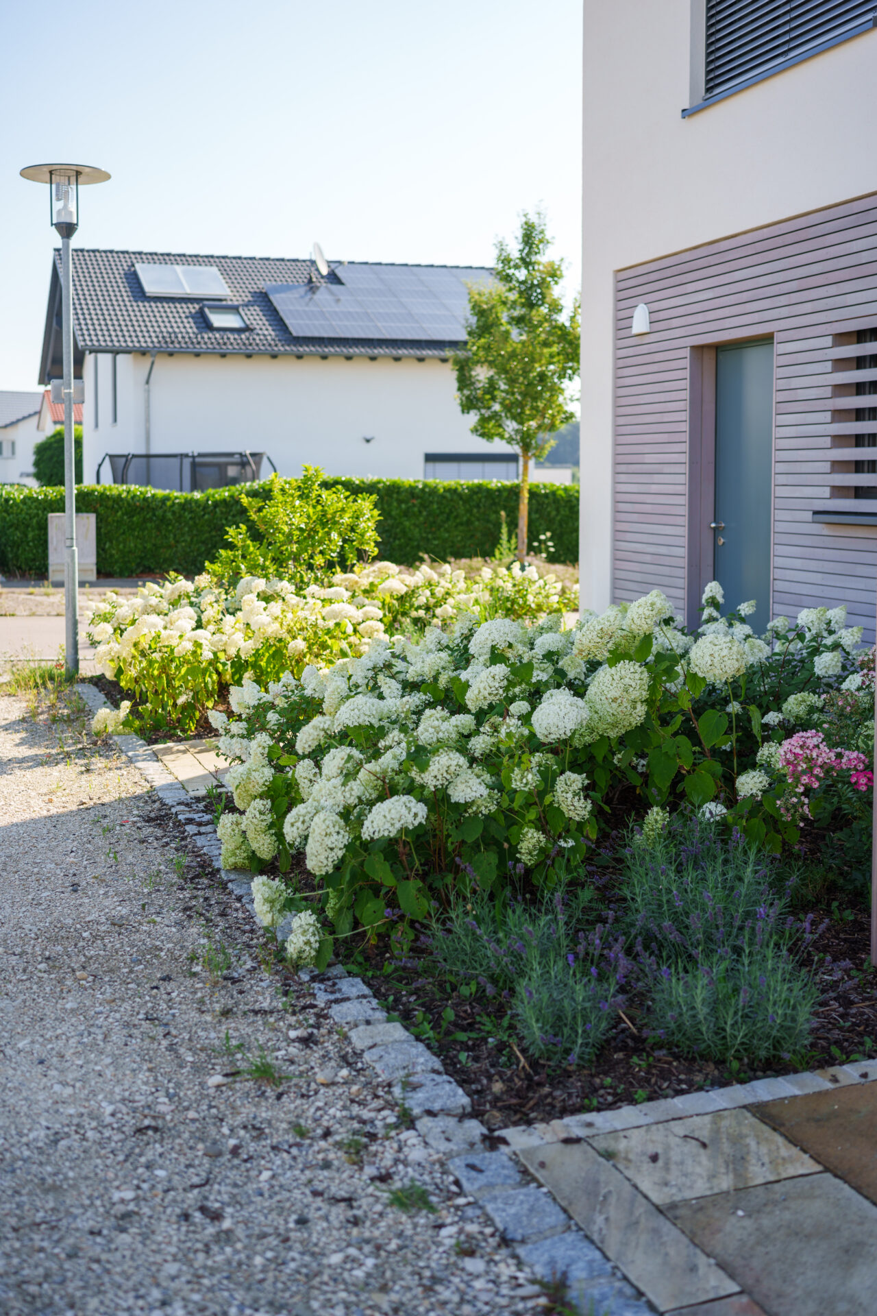 Ein Garten mit umspielender Bepflanzung, in dem sich Rasen auf zwei Ebenen an die große Holzterrasse anschmiegt. Die Hauptwege wurden mit edlen Quarzitplatten belegt, die Hofzufahrt und kleine Sitzplätze wurden aus kalkschattiertem Betonpflaster gebaut. Die Dachplatane spendet Schatten auf dem Sitzplätzchen, währen der Blumenhartriegel neben dem Quellstein blüht. Der Vorgarten ist ein Meer aus Hortensien und Lavendel, gespickt mit Gräsern und Rosen.