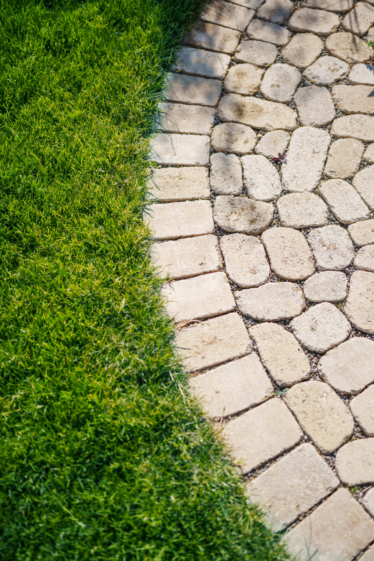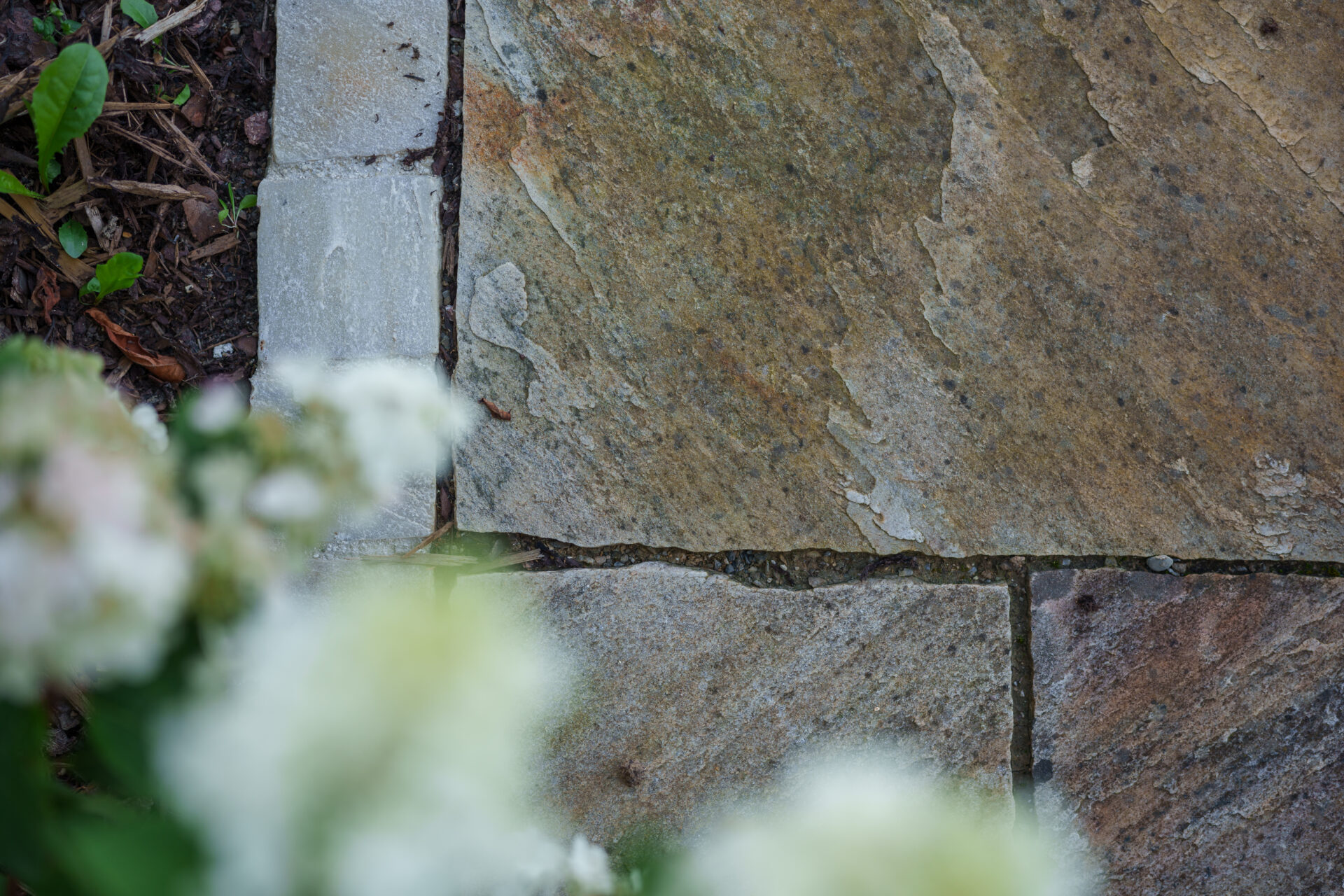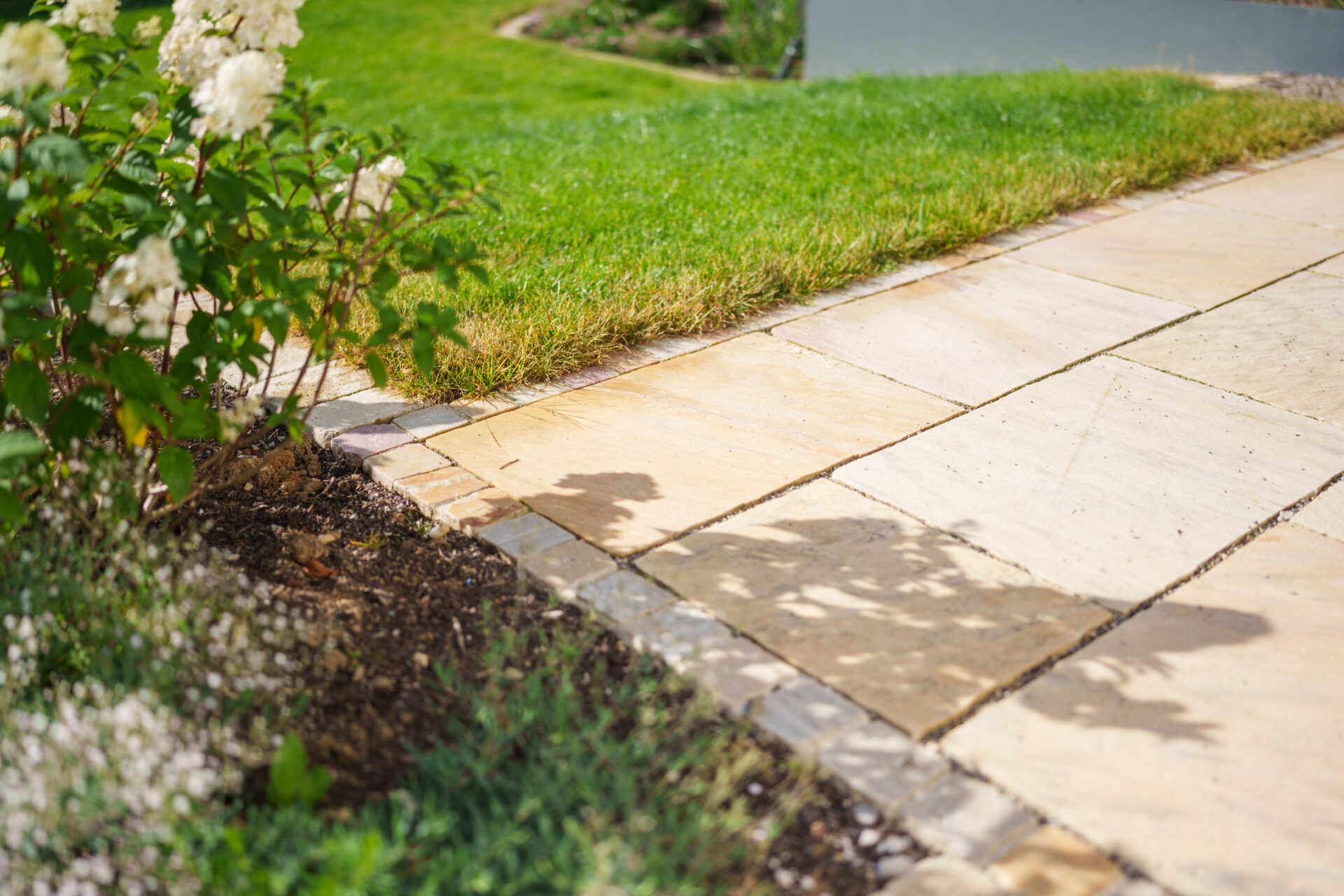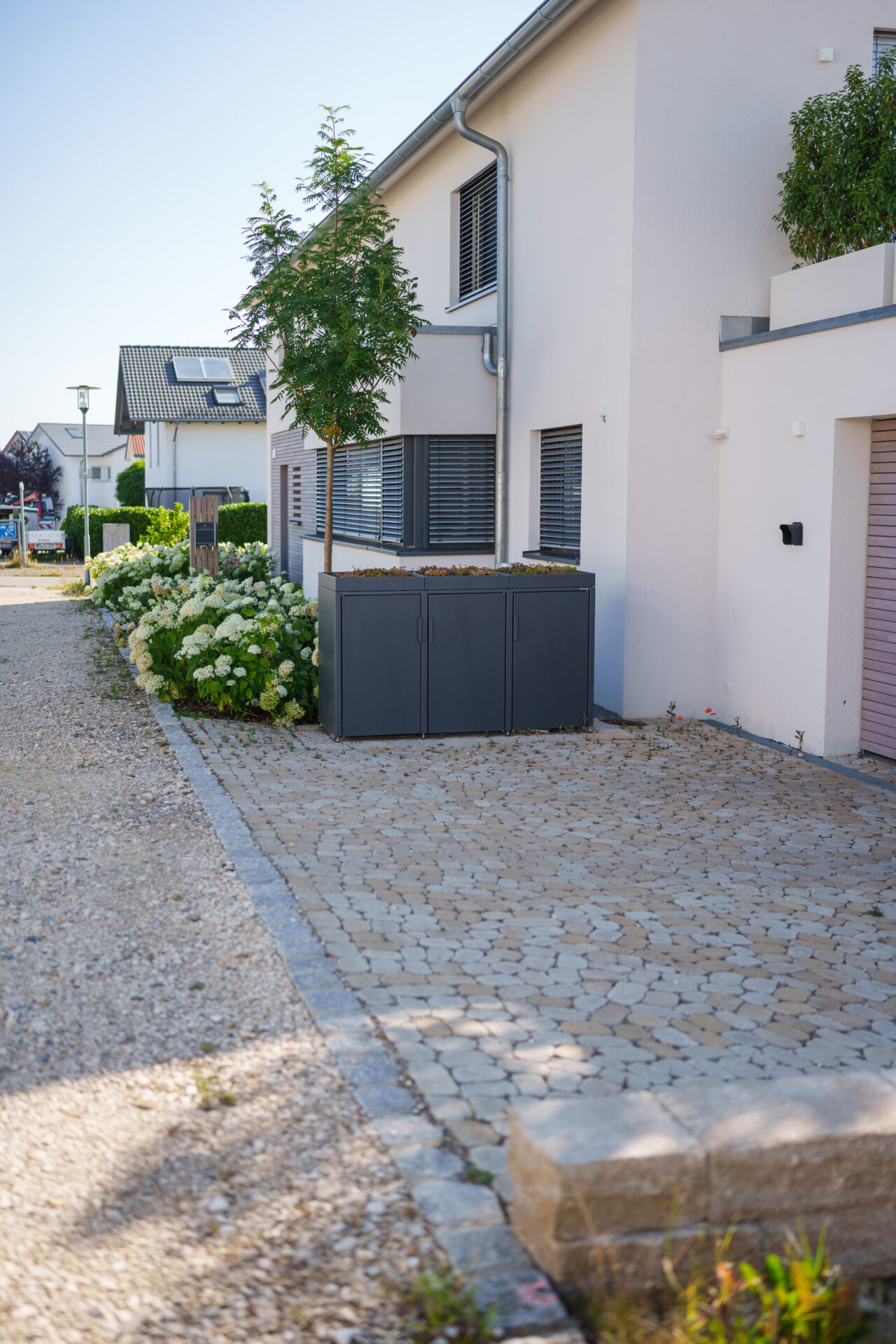 Ein Garten mit umspielender Bepflanzung, in dem sich Rasen auf zwei Ebenen an die große Holzterrasse anschmiegt. Die Hauptwege wurden mit edlen Quarzitplatten belegt, die Hofzufahrt und kleine Sitzplätze wurden aus kalkschattiertem Betonpflaster gebaut. Die Dachplatane spendet Schatten auf dem Sitzplätzchen, währen der Blumenhartriegel neben dem Quellstein blüht. Der Vorgarten ist ein Meer aus Hortensien und Lavendel, gespickt mit Gräsern und Rosen.