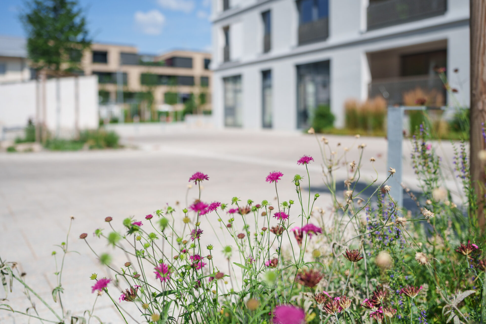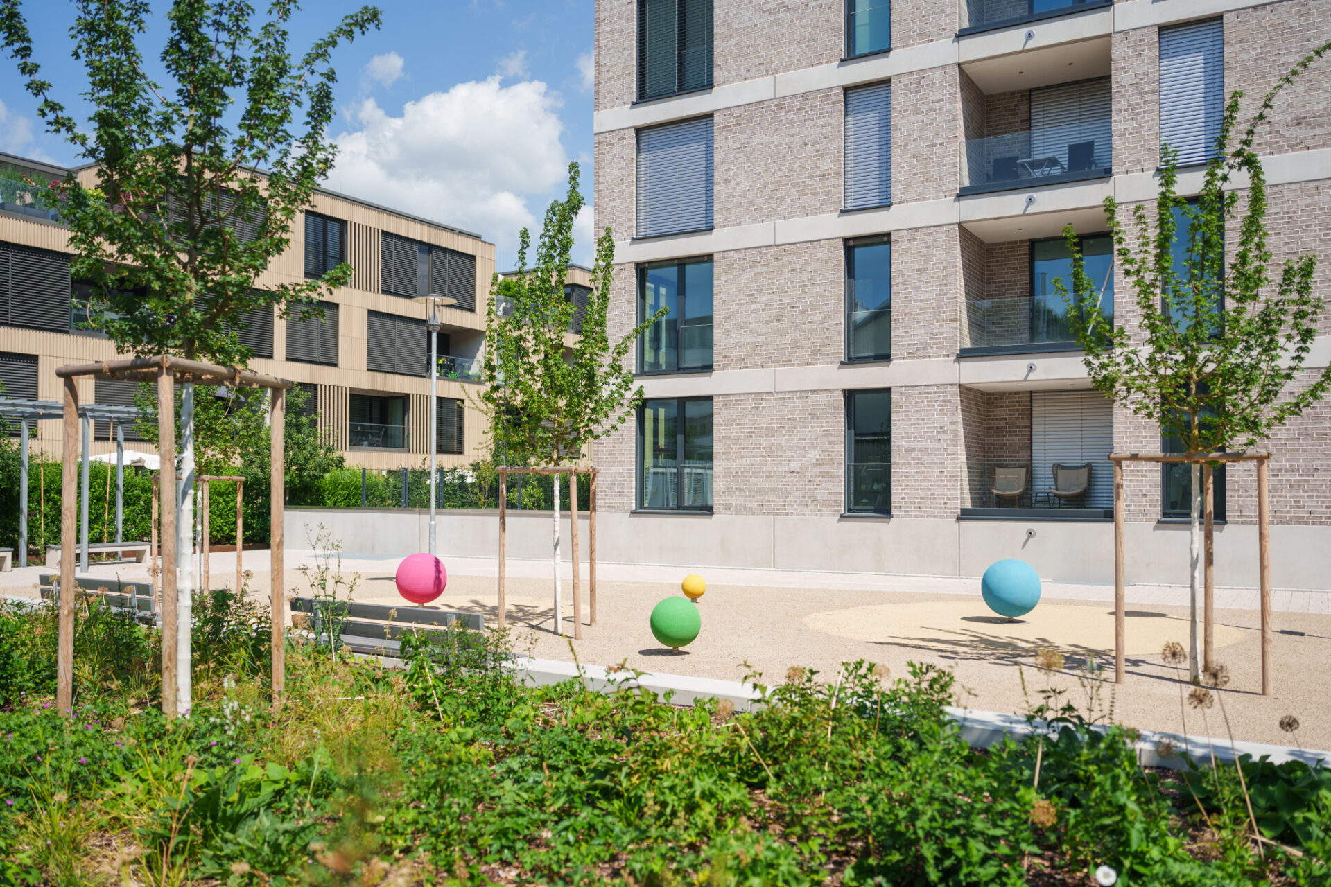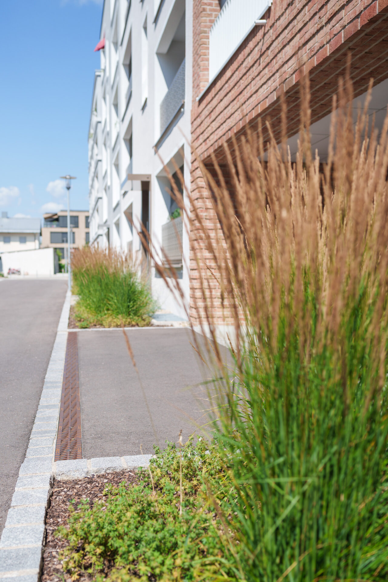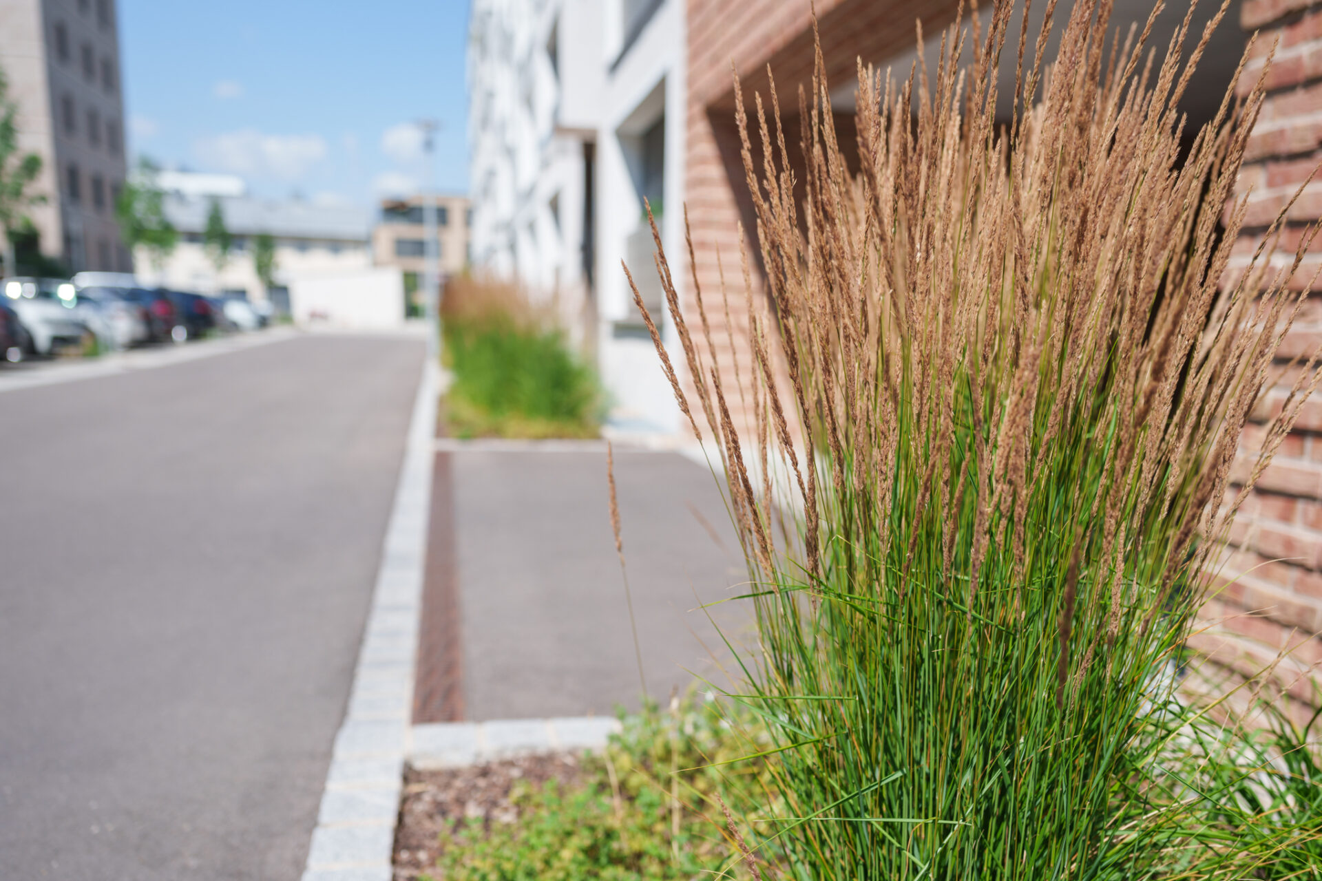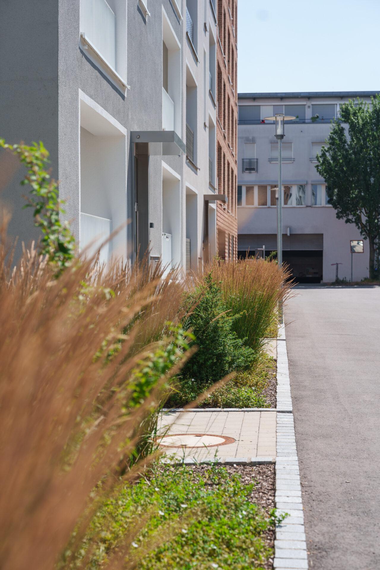 Ein weiterer Teil wird fertigNever change a running system. Gemäß diesem Motto gelang auch die Fertigstellung des dritten Bauabschnitts mit öffentlichen Spielbereichen, privaten Hochgärten und einer Zufahrt im besonders kraftschlüssigen Ellenbogenverband. Rankpflanzen werden die Pergola begrünen, während schon die Gräser und Perovskien im Wind an den Wohnungen entlang schwingen.